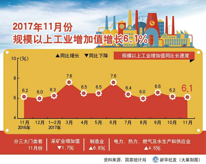 图表:2017年11月份规模以上工业增加值增长6.1% 新华社发 大巢制图