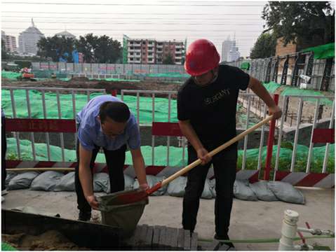 菜园街工程目前正进行基坑土方开挖作业,防止雨水倒灌及边坡冲刷,对保障工程基坑安全至关重要。接到指令后,项目经理李文龙、项目书记叶春林立即组织项目部全体管理人员,利用休息时间,对现场的防雨措施及基坑边坡进行全面排查。排查中发现个别部位防汛沙袋缺失,有雨水灌槽的风险。李文龙经理、叶春林书记亲自带队,立即组织管理人员装沙袋、堵缺口。经过近两个小时的奋战,基坑周边有倒灌危险的部位全部封堵完成。